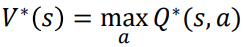 유사하게, 최적 정책은 최적의 가치 함수를 초래하는 정책이다. 최적가치함수𝑉(𝑠)는 다른 모든 가치함수(maximum return)에 비해 높은 값을 가지므로 Q함수의 최댓값이 된다. 따라서 최적 가치 함수는 다음과 같이 Q 함수의 최댓값을 취함으로써 쉽게 계산할 수 있다.