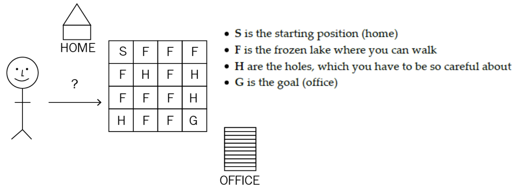Frozen Lake Problem의 환경은 집에서 사무실까지 이어지는 얼어붙은 호수가 있고 사무실에 가려면 얼어붙은 호수 위를 걸어야 한다. 하지만 얼어붙은 호수에는 구멍이 있으므로 구멍에 갇히지 않도록 얼어붙은 호수 위를 걷는 동안 조심해야 한다.