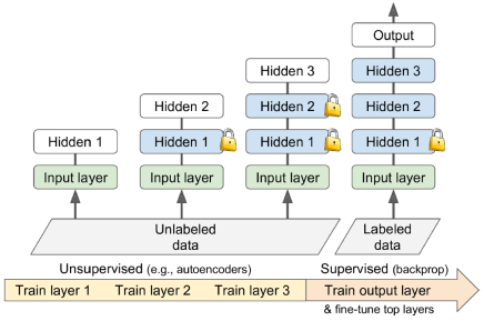 충분한 양의 라벨이 없는 훈련 데이터를 수집할 수 있다면, 비지도 학습 모델인 오토인코더 또는 생성적 적대 신경망(GAN)과 같은 모델을 훈련하는 것을 시도할 수 있다. 그런 다음 오토인코더의 하위 레이어 또는 GAN의 판별자의 하위 레이어를 재사용하고, 이에 새로운 작업을 위한 출력 레이어를 추가한 후 지도 학습(라벨이 지정된 훈련 예제를 사용한 학습)을 통해 최종 네트워크를 세밀하게 조정(finetune)할 수 있다.