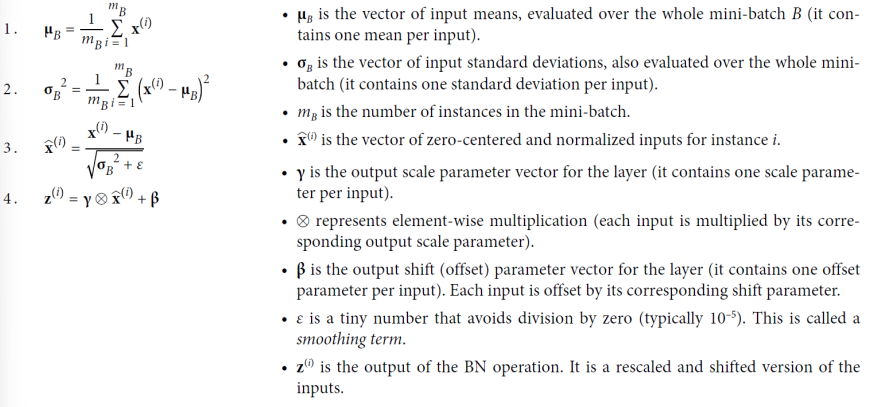 Keras에서는 BN을 구현하기 위해 각 은닉 레이어의 활성화 함수 전후에 BatchNormalization 레이어를 추가하면 된다. 이때 각 BN 레이어당 4개의 매개변수가 추가되며, 이 중 마지막 두 매개변수는 이동 평균을 나타낸다. BN 레이어를 활성화 함수 앞에 추가하는 것이 더 좋다는 주장도 있으나, 작업에 따라 다를 수 있습니다. 이 경우에는 이전 레이어의 편향 항을 제거해야 한다.
