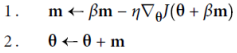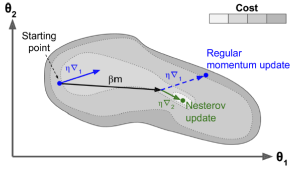 Nesterov Accelerated Gradient (NAG)는 모멘텀 최적화의 작은 변형 중 하나로, 거의 항상 기본적인 모멘텀 최적화보다 빠르다. 이 방법은 비용 함수의 그래디언트를 로컬 위치 θ가 아닌 모멘텀 방향인 θ + βm에서 약간 앞서 측정한다. 일반적으로 모멘텀 벡터는 올바른 방향(즉, 최적점 방향)을 가리키기 때문에 원래 위치에서의 그래디언트보다 조금 더 앞서 위치에서의 그래디언트를 사용하는 것이 더 정확할 수 있다. 주의할 점은 모멘텀이 가중치를 계곡을 향해 밀어내면, ∇1은 계곡을 더 넓게 향해 밀어내지만, ∇2는 다시 계곡의 바닥 쪽으로 밀어냅니다. 이로써 진동을 감소시켜 NAG는 빨리 수렴하게 된다.