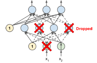 Dropout (드롭아웃)은 딥 뉴런 네트워크에서 가장 인기 있는 정규화 기법 중 하나이다. 각 훈련 단계에서 모든 뉴런(입력 뉴런 포함, 단, 출력 뉴런은 제외)은 일시적으로 '드롭아웃'될 확률 p를 가진다. 이는 해당 훈련 단계 동안 완전히 무시될 것이지만 다음 단계에서는 활성화될 수 있다. 여기서 p는 드롭아웃 비율로, 일반적으로 10%에서 50% 사이로 설정된다. 훈련 후에는 뉴런이 더 이상 드롭되지 않는다.