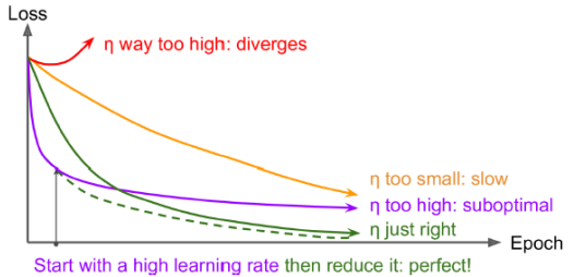 일정한 에폭 동안 상수 학습률을 사용하고, 그 후 더 작은 학습률로 전환한다. 예를 들어, 처음 5 에폭 동안은 𝜂𝜂0 = 0.1로 유지하고, 다음 50 에폭 동안은 𝜂𝜂1 = 0.001로 설정하고 이런 식이다.