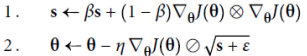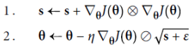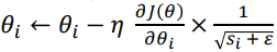 첫 번째 단계에서는 기울기의 제곱을 벡터 s에 누적시킨다. 이는 각 차원의 기울기에 대한 편도 함수의 제곱을 누적하는 것으로, 비용 함수가 i번째 차원을 따라 가팔라질수록 벡터 s의 각 요소가 반복마다 커지게 된다. 두 번째 단계는 거의 Gradient Descent와 동일하지만 큰 차이가 있다. 기울기 벡터는 s + ε의 비율로 축소된다. 여기서 ε는 0으로 나누기를 피하기 위한 부드러운 항으로, 일반적으로 10^-10과 같은 작은 값으로 설정된다. 이러한 비율로 기울기 벡터를 축소하는 것은 학습률을 점차 감소시키는 효과를 낸다. 이는 기울기가 가파른 차원에서는 더 빠르게, 부드러운 경사를 가진 차원에서는 느리게 학습률이 줄어들게 된다.