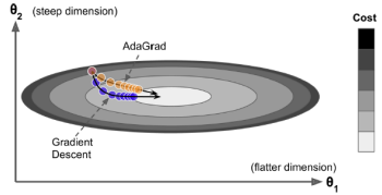 이 알고리즘은 적응형 학습률을 사용하므로 가파른 차원으로 직접적으로 더 잘 향하게 한다. AdaGrad는 단순한 이차 문제에 대해 자주 잘 작동하지만, 신경망을 훈련할 때 종종 학습률이 너무 많이 감소하여 전역 최적점에 도달하기 전에 훈련이 완전히 중단될 수 있다. 따라서 Keras에는 Adagrad 옵티마이저가 있지만 이를 사용하여 심층 신경망을 훈련시키지 않는 것이 좋다.