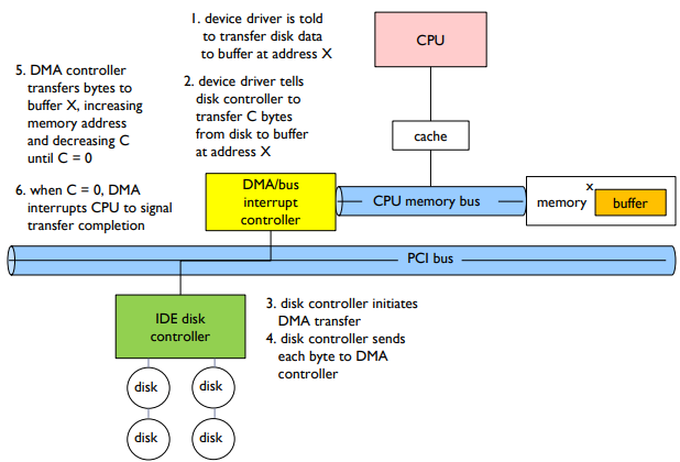 직접 메모리 접근(Direct Memory Access, DMA)은 대량의 데이터 이동에 프로그램 제어 입출력(Programmed I/O)를 피하기 위해 사용된다. DMA 컨트롤러에게 메모리 버스 접근 권한을 부여하여 CPU를 우회하고 I/O 장치와 메모리 간에 데이터를 직접 전송한다. DMA 전송을 수행하기 위해 다음과 같은 여섯 단계의 과정이 있다.