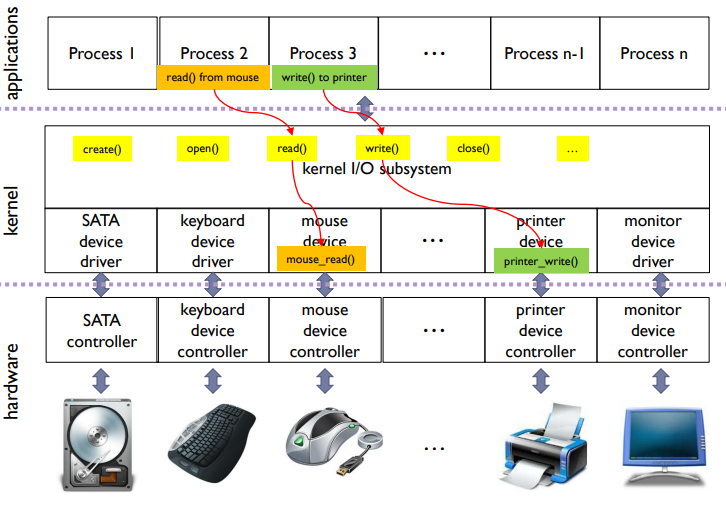 I/O 서브시스템( I/O structure)은 다양한 장치들에 대한 표준 인터페이스를 제공하며, create, open, read, write, close 등과 같은 함수를 통해 다양한 장치에 대한 입출력을 처리한다. 이를 통해 같은 코드가 다양한 장치에서 동작할 수 있다. 또한, I/O 서브시스템은 디바이스 드라이버와의 협력을 위한 프레임워크를 제공하여 장치별로 특정한 동작을 수행할 수 있게 한다. 디바이스 드라이버는 커널 내에서 디바이스 하드웨어와 직접 상호작용하는 장치별 코드이다.