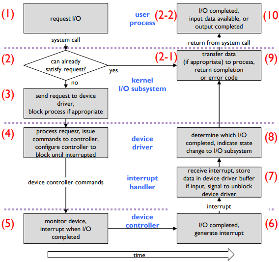 - I/O 하위 시스템은 I/O 스케줄링, 버퍼링, 캐싱 및 스풀링과 같은 다양한 서비스도 제공한다.
