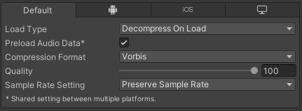 - Decompress On Load : 즉시 압축 해제되면서 발생하는 퍼포먼스 오버헤드를 피하려면 작은 압축 사운드에는 이 옵션을 사용해야 한다. 로딩 시 Vorbis로 인코딩된 사운드의 압축 해제는 압축 상태를 유지하는 것보다 열 배 이상의 메모리를 사용하므로(ADPCM 인코딩의 경우, 3.5배), 큰 파일에는 사용하지 말자.