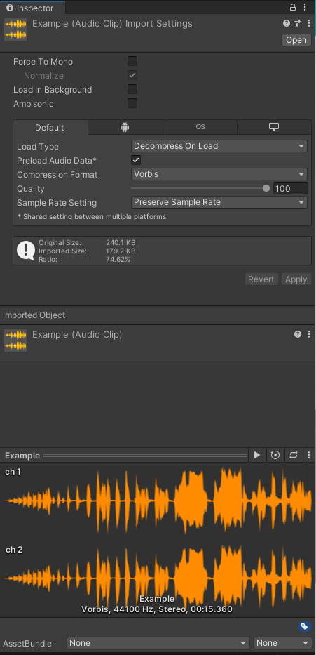 - Quality: Compressed 클립에 적용되는 압축량을 정해준다. PCM/ADPCM/HEVAG 형식에는 적용되지 않는다. 파일 크기에 대한 통계는 인스펙터에서 확인할 수 있다.
