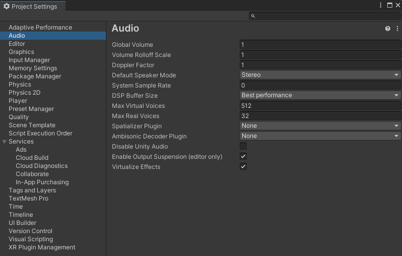 - Max Virtual Voices: 오디오 시스템에서 관리하는 가상 음성의 수를 설정한다. 이 값은 게임에서 재생되는 음성의 수보다 항상 커야 한다. 그렇지 않으면 Unity가 콘솔에 경고를 표시한다.