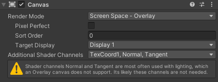 - Additional Shader Channels: 캔버스 메시를 만들 경우 이곳에서 사용할 추가 셰이더 채널의 마스크를 불러오거나 설정할 수 있다.