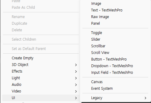 모든 UI 요소는 Canvas 안에 위치해야 합니다. 캔버스는 Canvas 컴포넌트가 있는 게임 오브젝트이며 모든 UI 요소는 반드시 어떤 캔버스의 자식이어야 합니다.