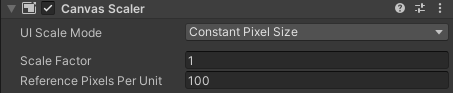 캔버스 스케일러(Canvas Scaler) 컴포넌트는 캔버스 내 UI 요소의 전체적인 스케일과 픽셀 밀도를 제어하는 데 사용된다. 스케일은 글꼴 크기와 이미지 경계 등 캔버스 아래의 모든 요소에 영향을 미친다.