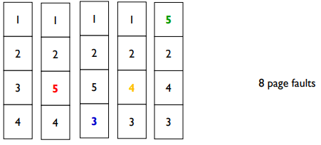 다른 프레임 예시 {1, 2, 3, 4, 1, 2, 5, 1, 2, 3, 4, 5}인 경우 아래와 같은 결과를 얻을 수 있다. 최적 알고리즘은 알고리즘이 얼마나 잘 수행되는지 최적의 알고리즘은 페이지 부재율의 하한값을 제시함으로써 사용된다.