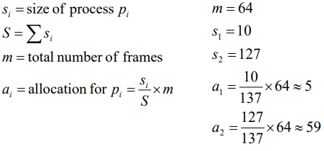 - Proportional Allocation(비례 할당): 프로세스의 크기에 따라 메모리를 할당하는 방식이다. 각 프로세스의 크기에 비례하여 메모리를 할당한다. 예를 들어, 프로세스 A가 프로세스 B보다 큰 경우, A에 더 많은 메모리를 할당한다. 이 방식은 프로세스의 크기를 고려하여 자원을 할당하여 효율적인 메모리 사용을 도모한다.