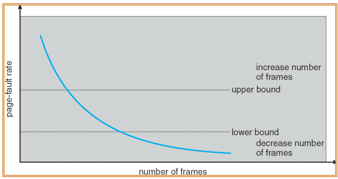 이러한 방식을 통해 페이지 폴트 비율을 모니터링하고 프레임 할당을 조절하여 페이지 폴트의 적절한 수준을 유지할 수 있다. 페이지 폴트 비율이 허용 범위를 벗어나면 프로세스의 프레임 할당이 조정되어 최적의 성능을 유지할 수 있다.