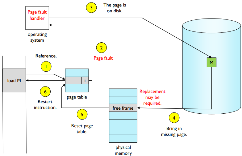 유효하지 않은 페이지에 액세스하면 페이지 오류가 발생한다. OS 내에서 페이지 폴트 핸들러(Page fault handler)가 호출되어 다음과 같이 페이지 폴트를 처리한다.