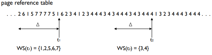 작업 집합 모델은 지역성을 가정으로 하는 모델이다. ∆ (working-set window)는 고정된 페이지 참조의 수로 정의된다. WSSi (Process Pi의 working set)는 최근 ∆ 내에서 참조한 페이지의 총 수이다. ∆가 너무 작으면 전체 지역성을 포괄하지 못한다. ∆가 너무 크면 여러 지역성을 포괄하게 된다. ∆ = ∞ 인 경우, 전체 프로그램을 포괄하게 된다. D = Σ WSSi는 총 요구 프레임 수를 의미한다. D > m인 경우, 스레싱이 발생한다. 이 경우 하나의 프로세스를 중단시키는 조치를 취할 수 있다.