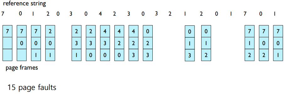 - 빈 프레임(free frame, 메모리의 공간)을 찾는다. 빈 프레임이 있으면 해당 프레임을 사용한다. 빈 프레임이 없는 경우 페이지 교체 알고리즘을 사용하여 희생될 페이지(victiom page)를 선택한다.