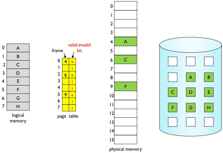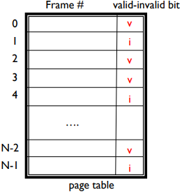 페이지를 참조할 때, 유효한(valid) 참조면 참조하고 유효하지 않은(invalid) 참조이면 현재 메모리에 없으므로 메모리로 가져온다. 다음 그림과 같이 유효-무효 비트(valid–invalid bit)는 각 페이지 테이블 항목과 연결된다.(v 메모리 내, i 메모리에 없거나 적합하지 않음(잘못된 주소, 보호 위반)) 주소 변환 중 유효-무효 비트가 i이면 페이지 폴트(page fault)이다.