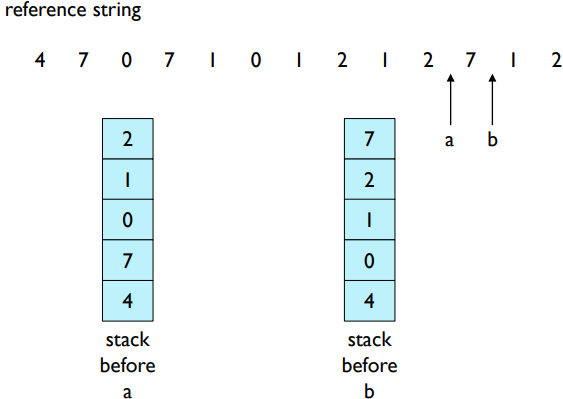 - 스택 구현(Stack implementation): 페이지들의 스택을 유지한다. 페이지가 참조되면 해당 페이지를 스택의 맨 위로 이동시킵니다. 교체를 위한 검색이 필요하지 않다.