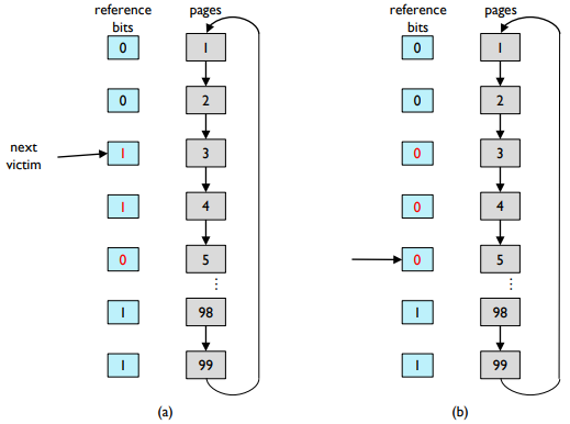 - Second chance 페이지 교체 알고리즘 (시계 알고리즘)은 교체해야 할 페이지의 참조 비트가 1인 경우, 해당 페이지를 메모리에 남겨둔다. 그리고 참조 비트를 0으로 설정한다. 다음 희생될 페이지를 선택하기 위해 포인터를 이동시키는데, 참조 비트가 0인 페이지를 찾을 때까지 포인터를 계속 이동시킨다.
