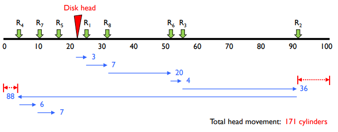 - 탐색 시간을 최소화하기 위한 많은 디스크 I/O 스케줄링 알고리즘이 있다. SSTF, SCAN 및 C-SCAN이 그러한 예이다.