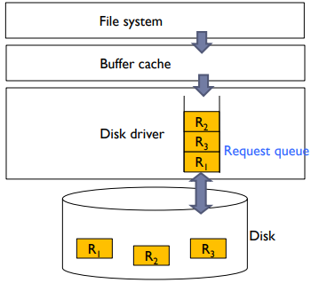 - 디스크 I/O 스케줄러는 요청이 완료되면 요청 대기열에서 다음 요청을 선택한다.