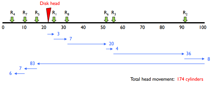 SSTF(Shortest Seek Time First)은 현재 헤드 위치로부터 최소 탐색 시간을 가진 요청을 우선적으로 처리하는 방식이다. 이는 탐색 시간이 가장 짧은 요청을 선택하는 탐욕 알고리즘(greedy algorithm)이다. 예를 들어, 주어진 요청 큐 상태와 헤드의 위치에 따라 SSTF 알고리즘이 동작한다. 아래 그림을 보면, FCFS과 동일한 조건에서 SSTF으로 동작하는 상황이다. 이 상황에서 디스크 헤드의 총 이동 거리가 126이 된다. 그러나 이 알고리즘은 탐욕적인 방식으로 동작하기 때문에 일부 요청들이 배제될 수 있는 기아(starvation) 현상을 초래할 수 있다.