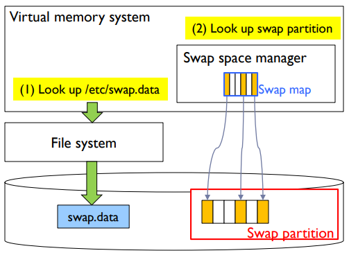 - 스왑 공간은 파일 시스템의 일반 파일 또는 별도의 디스크 파티션으로 구현 가능하다.