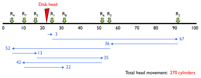 FCFS (First Come First Served)는 도착한 순서대로 요청을 처리한다. 예를 들어, 큐에 {R1(25), R2(92), R3(56), R4(4), R5(17), R6(52), R7(10), R8(32)}이 들어왔고, 현재 디스크 헤드는 22에 있다. 이 조건에서 디스크 헤드의 총 이동 거리가 270이 된다. FCFS는 탐색 거리가 너무 길어지는 단점이 있다.