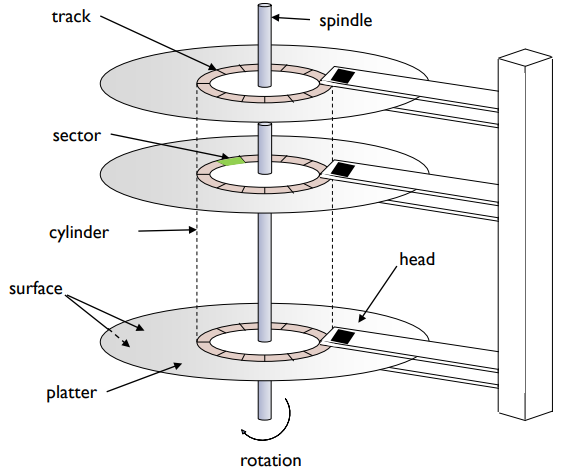 - 회전 지연(Rotational delay): 원하는 섹터가 디스크 헤드에 도달하기까지 디스크가 회전하는 시간이다. 회전 지연은 최상의 경우 0이지만, 최악의 경우 한 번의 회전에 걸리는 시간까지 소요될 수 있다.