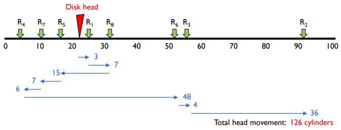 SSTF(Shortest Seek Time First)은 현재 헤드 위치로부터 최소 탐색 시간을 가진 요청을 우선적으로 처리하는 방식이다. 이는 탐색 시간이 가장 짧은 요청을 선택하는 탐욕 알고리즘(greedy algorithm)이다. 예를 들어, 주어진 요청 큐 상태와 헤드의 위치에 따라 SSTF 알고리즘이 동작한다. 아래 그림을 보면, FCFS과 동일한 조건에서 SSTF으로 동작하는 상황이다. 이 상황에서 디스크 헤드의 총 이동 거리가 126이 된다. 그러나 이 알고리즘은 탐욕적인 방식으로 동작하기 때문에 일부 요청들이 배제될 수 있는 기아(starvation) 현상을 초래할 수 있다.