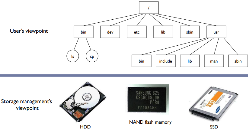 저장 관리 관점에서 파일 시스템은 논리적인 파일 시스템을 실제 저장 장치에 매핑하는 방법을 다룬다. 이를 위해 파일 시스템은 레이아웃, 데이터 구조, 알고리즘 등을 사용하여 파일을 저장하고 관리한다. 파일 시스템은 데이터를 저장 장치에 효율적으로 배치하고 접근하기 위해 저장 장치의 내부 구조를 이해하고 활용한다.