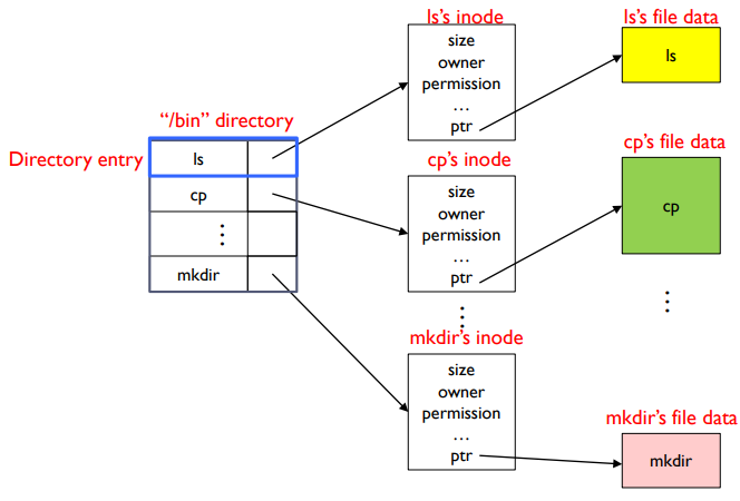 유닉스에서 디렉터리 엔트리는 (파일 이름, 아이노드 번호)의 형태로 저장되며, 아이노드는 (속성, 파일 데이터에 대한 포인터)를 포함한다.