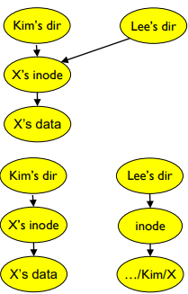 하드 링크(Hard link)는 Lee의 디렉터리에 X의 메타데이터를 복사하여 링크를 생성하는 방식이다. 참조 카운트를 사용하여 X를 삭제할 때 처리된다. 심볼릭 링크(Symbolic link)는 Lee의 디렉터리에서 X의 경로명을 생성하는 방식이다. X를 삭제할 때 링크가 남아 있는 문제가 발생할 수 있다.