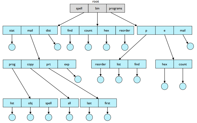 - 비순환 그래프 디렉터리: 서브디렉터리와 파일을 공유하는 디렉터리이다. 동일한 파일(또는 서브디렉터리)이 두 개의 다른 디렉터리에 있을 수 있다. 이로 인해 탐색 문제와 삭제 문제가 발생할 수 있다.