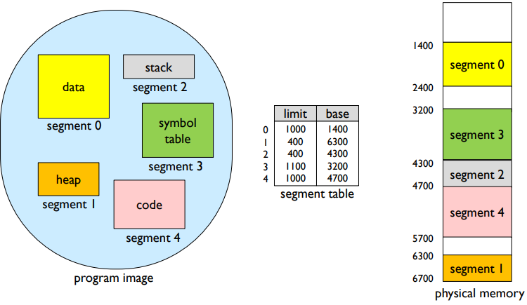 각 세그먼트는 세그먼트 테이블(Segment Table)에 의해 관리된다. 세그먼트 테이블은 세그먼트의 논리적 주소와 물리적 주소 사이의 매핑 정보를 저장하는 데이터 구조이다. 세그먼트 테이블의 각 엔트리는 세그먼트의 기준(base) 주소와 한계(limit)를 포함하고 있다. 기준 주소는 해당 세그먼트의 시작 위치를 가리키며, 한계는 세그먼트의 크기와 세그먼트 메모리에 상주하는 시작 물리적 주소를 나타낸다. 한계 주소는 세그먼트의 길이를 나타낸다. 세그먼트 테이블 베이스 레지스터(Segment-table base register, STBR)는 메모리에서 세그먼트 테이블의 위치를 가리킨다. 세그먼트 테이블 길이 레지스터(Segment-table length register, STLR)는 프로그램에서 사용하는 세그먼트 수를 나타낸다. 세그먼트 번호 s는 s < STLR인 경우에 유효하다.