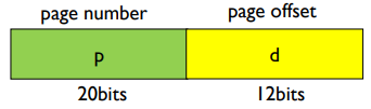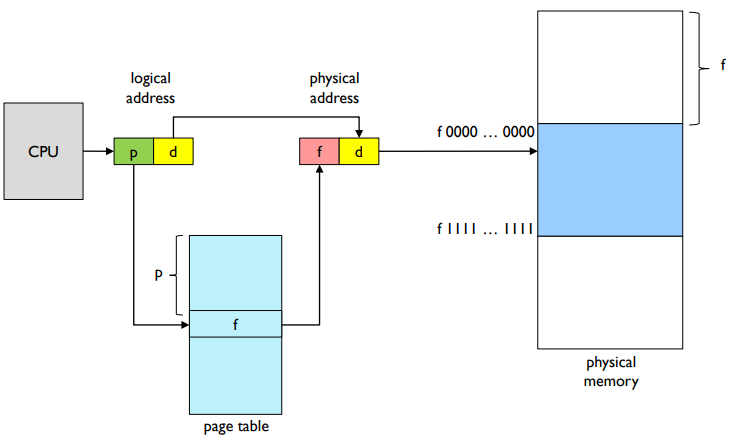 CPU에서 생성되는 논리 주소는 두 부분으로 나뉜다. 예를 들어, 주어진 주소 길이는 32이고 페이지 크기는 4KB일 때, 아래 그림과 같이 페이지 번호(p)와 페이지 오프셋(d)으로 나눌 수 있다. 페이지 번호는 페이지 테이블이 인덱스로 사용되며, 물리적 메모리에 있는 각 페이지 프레임의 기본 주소를 포함한다. 페이지 오프셋은 기본 주소와 결합하여 물리적 메모리 주소를 정의한다.