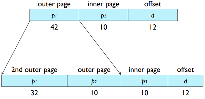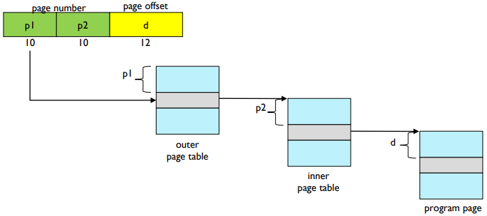 논리 주소(4K 페이지 크기의 32비트)를 분할하여 20비트 페이지 번호와 12비트 페이지 오프셋으로 나눌 수 있다. 심지어 페이지 테이블 자체가 페이징 되므로 페이지 번호를 외부 페이지 테이블의 인덱스용 10비트와 내부 페이지 테이블의 인덱스용 10비트로 분할된다.