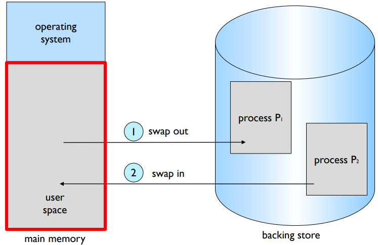 스와핑(Swapping)은 운영체제에서 메모리 관리를 위해 사용되는 기법으로, 현재 메모리에 적재(load)되어 있는 프로세스나 프로그램의 일부를 일시적으로 메모리에서 보조기억장치(하드 디스크 등)로 이동시키는 것을 말한다. 그런 다음 나중에 메모리로 다시 가져온다.