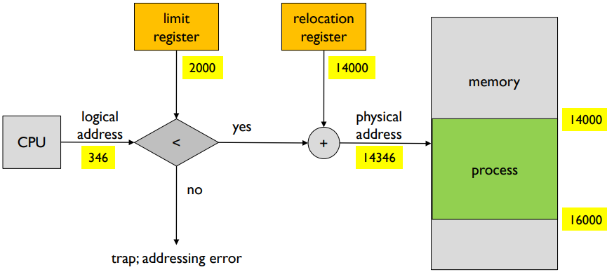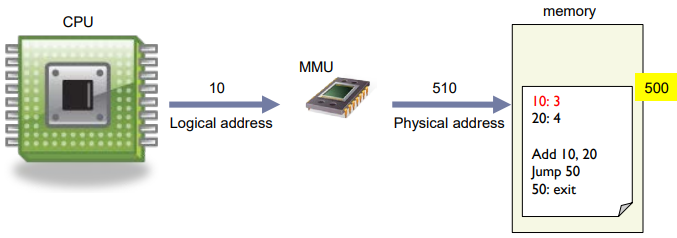 논리 주소(Logical address)란 CPU에 의해 생성되며 가상 주소라고도 한다. 물리적 주소(Physical address)란 메모리 장치가 본 주소이다. 메모리 관리 장치는 논리 주소를 물리 주소에 매핑하는 하드웨어이다. 아주 단순한 MMU 기법은 재배치(relocation) 레지스터의 값을 CPU에서 생성된 모든 주소에 추가하는 방식이다. 사용자프로그램 및 CPU는 논리 주소를 처리하지만 물리 주소는 볼 수 없는 것에 주의해야 한다.