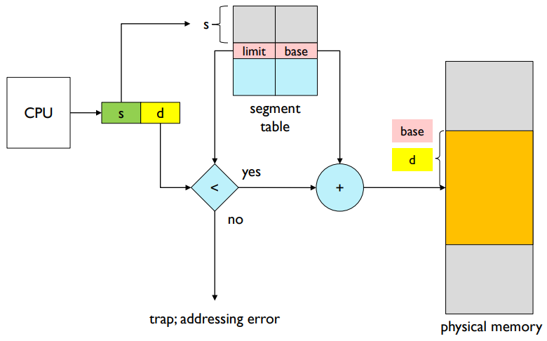 프로그램이 실행될 때, 주소 변환 단계에서는 세그먼트 번호와 세그먼트 내 오프셋을 이용하여 논리적 주소를 물리적 주소로 변환한다. 이를 위해 세그먼트 번호는 세그먼트 테이블의 인덱스로 사용되고, 해당 인덱스의 엔트리에서 기준 주소와 한계를 확인하여 물리적 주소를 계산한다.