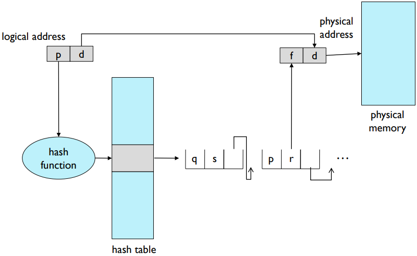 주소 공간이 32비트보다 커지면 가상 주소를 해시로 사용하는 해시 페이지 테이블을 많이 쓴다. 해시 페이지 테이블은 해시 테이블을 사용하여 논리 페이지 번호를 해싱한다. 해시 테이블은 동일한 위치에 해시된 요소들을 포함하는 체인으로 구성된다. 논리 페이지 번호는 체인 내 항목들의 첫 번째 필드와 일치 여부를 비교한다. 일치하는 항목을 찾으면 해당하는 물리 프레임 번호를 추출한다.