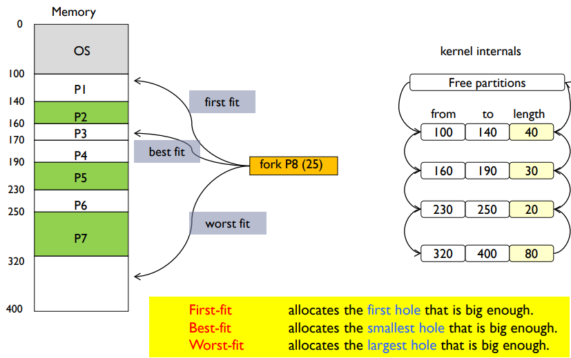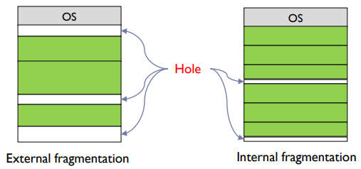 메모리 할당에는 컴퓨터 시스템의 프로세스나 프로그램에 대한 메모리 할당이 포함된다. 메모리 할당 프로세스에는 일반적으로 프로세스의 요구 사항을 수용하기 위해 메모리의 적절한 부분을 찾는 작업이 포함된다. 메모리 할당에 대한 일반적인 접근 방식 중 하나는 메모리 공간 전체에 흩어져 있는 사용 가능한 큰 메모리 블록인 홀(Hole)을 사용하는 것이다. 프로세스가 생성되거나 추가 메모리를 요청할 때 운영 체제는 프로세스의 메모리 요구 사항을 수용할 수 있을 만큼 충분히 큰 구멍(여유 파티션)을 검색한다. 운영 체제는 현재 프로세스에 할당된 메모리 부분인 할당된 파티션과 할당되지 않은 메모리 부분인 사용 가능한 파티션 또는 홀에 대한 정보를 유지 관리한다. 전반적으로 홀을 사용한 메모리 할당에는 프로세스의 메모리 요구 사항을 수용할 수 있을 만큼 충분히 큰 가변 파티션(free partitions)을 찾는 작업이 포함된다. 운영 체제는 할당된 파티션과 여유 공간을 효율적으로 관리함으로써 프로세스에 필요한 메모리를 할당하는 동시에 시스템의 메모리 활용도를 최적화한다.